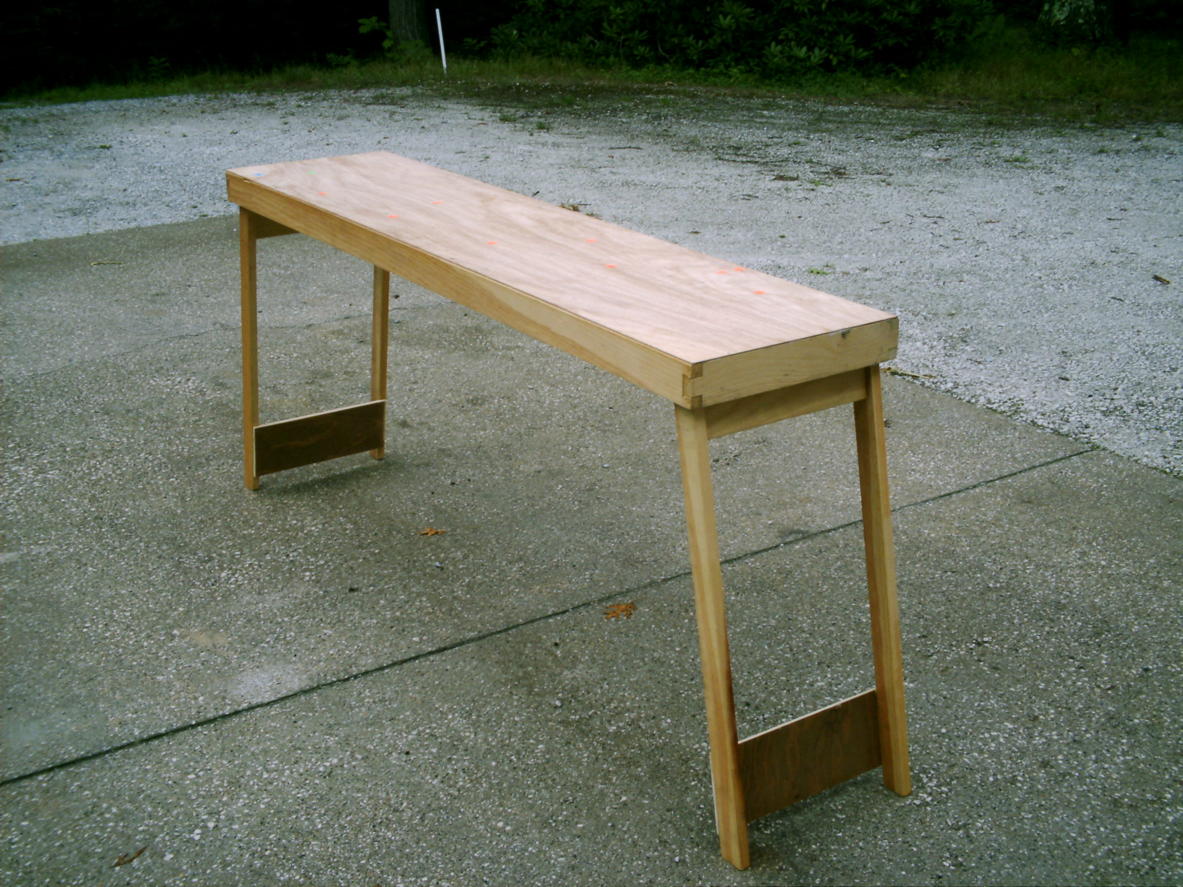 My secret to building a really nice looking drop cloth balloon is having or building an appropriately proportioned table. I built three 33" high, 5' long, 16" wide, light weight, wooden tables. I doubt I spent 5 bucks each to make them, but they are, like the Visa commercial would say, priceless. The table top has to be somewhat tolerant of heat, and you should be tolerant of the fact that the tops will eventually become scorched. In addition to the tables, I built a couple boxes that can be clamped between the ends of the tables to yield a continuous work area up to 17 feet long. If building custom tables just for ballooning is out of the question, you can do this on any large heat resistant surface. Erect or prepare your table or tables, and if you have more than one, pull a string to make sure you're at least close to straight. From here on out, regardless of how many tables you actually have, I'm going to refer to it as "the table".